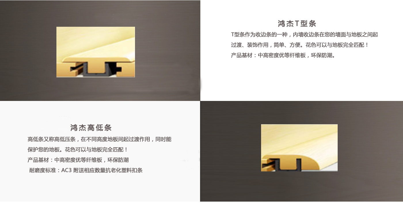 專業(yè)生產各類地板輔料。本廠成立于2008年,經過嚴格的質量控制,已開發(fā)出SPC、WPC、層壓板三種不同的壓花材料。每一種材料都有超過7種不同的過渡型材,如t型線、減速器、端蓋、四分之一圓、樓梯前鼻、樓梯板、踢腳板等。
